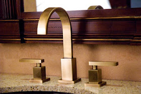 | Secant ribbon-spout faucet in antique brass by Newport Brass |